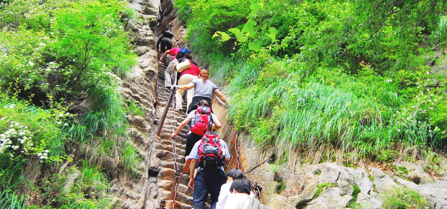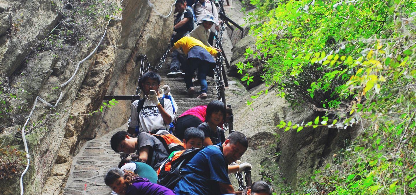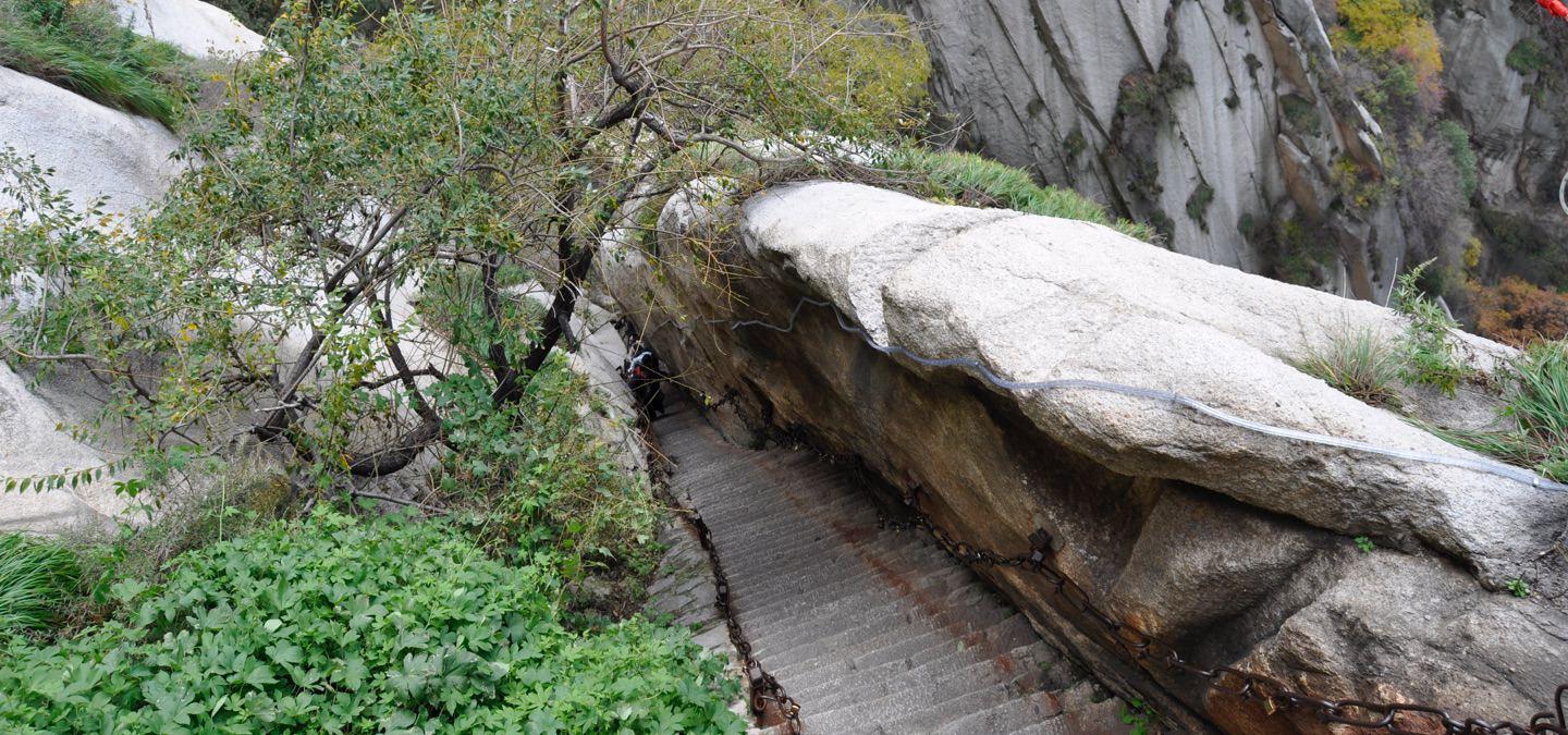 千尺幢,这是一条峭壁上的大裂缝,陷在两旁的巨石之间,共370余级台阶,坡度极陡,每级台阶的宽度不过三分之一的脚掌。 俯视脚下,如临深渊。石级顶端有如井口,倘若把“井口”用铁盖盖住,通往华山的道路便被堵塞,所以称之为“太华咽喉”。