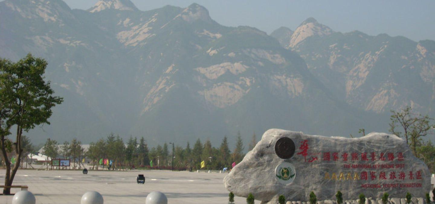 生态广场包括游客接待中、票务中心、导游服务中心、华山博物馆、生态停车场、直升机停机坪、旅游纪念品购物超市、快餐厅等。3.7万平方米的音乐喷泉广场围绕“洞天福地,宝莲祥瑞”的设计主题,将华山之雄,蕴于神话传说中,动静相宜、虚实结合,于北侧31米高的宝莲灯主题雕塑交相辉映。喷泉喷射高度最高可达40米,其中“阴阳图谱,太极水八卦”喷泉可旋转变化,新颖别致。广场的植物配置都是按照植物链科学设计、精心栽培、合理布局。左手边是24孝主题园。右手边是生态停车场,广场共设有14个停车场,3500多个停车位,2号停车场绿色大巴士景区区间车,游客持华山门票可免费乘坐,去游览华山景区其他景点——西岳庙、仙峪、玉泉院。售票大厅门口大石头上刻画的是华山全景图,方便游客了解华山景区概况、上山路线以及华阴的交通路线。售票大厅内,脚下是华山实景缩小沙盘,是以1:800的实景缩小比例设计的。售票大厅内设有13个窗口同时售票,正对门口的是游客咨询服务台,售票大厅最里面,是游客上下山乘车和下车的集散中心。