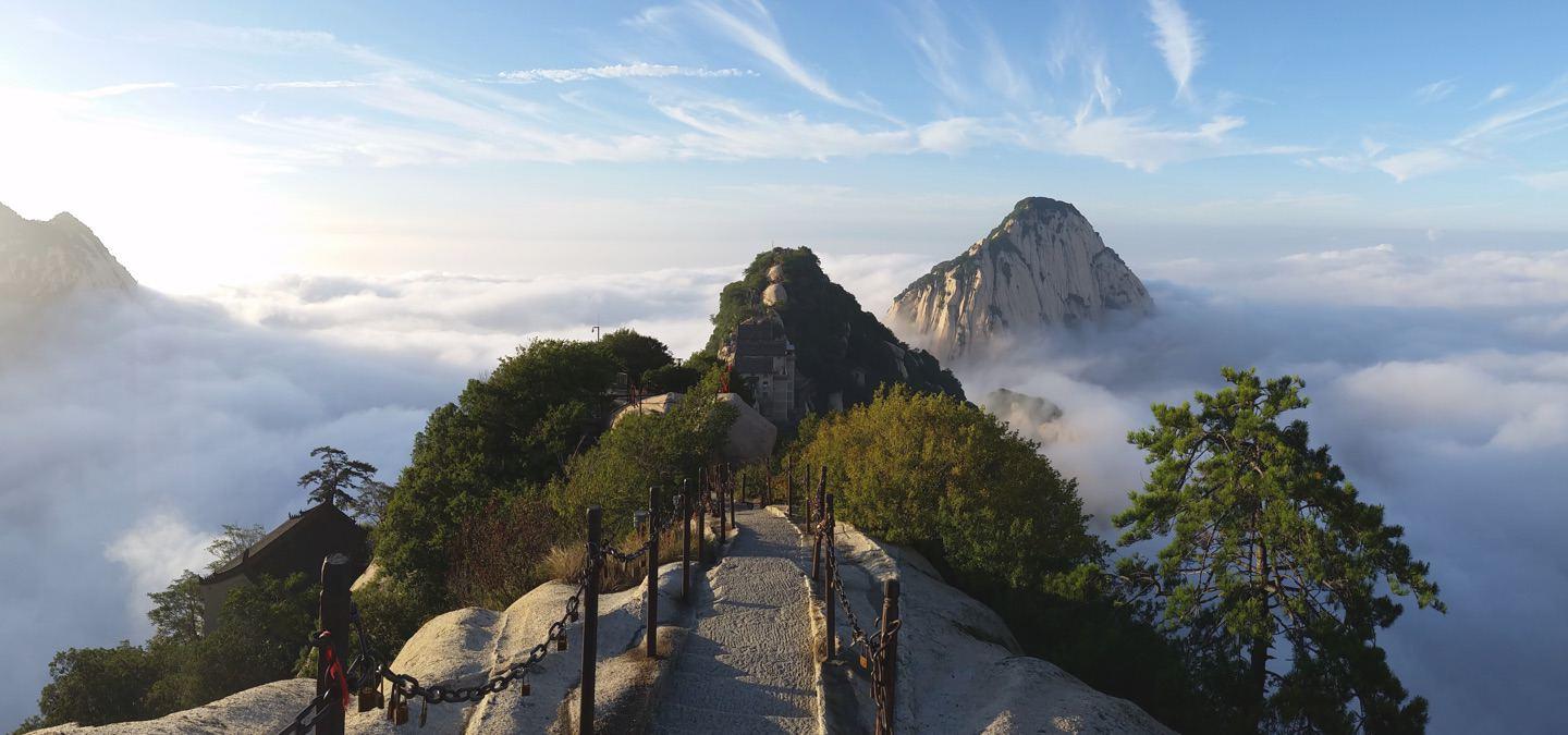 华山山势险峻,人们常用“自古华山一条路”来形容其险要。登华山必须由玉泉院出发,顺着澄明清凉的山泉而上,经五里关、石门、莎萝坪、毛女洞、云门至青柯坪。从青柯坪到五云峰(北峰),是华山最艰险的路程之一,中间经回心石,往上是危崖峭壁、突兀凌空的“千尺”。此是山崖裂出的一道缝子,人在缝中攀登而上,山路像从直升飞机吊下的悬梯一般,胆小的人会望而却步,故称“回心石”。 这座山处处是悬崖峭壁,山路险峻,攀起来惊心动魂。象千尺幢、百尺峡、老君犁沟、上天梯、苍龙岭皆是在峭壁绝崖上凿出,鹞子翻身是三面临空。再加上奇峰、怪石、云海、鸣泉、飞瀑、古迹等景观,不少人,慕名而来探险。但登到险处,俱胆战心惊,半途而返。