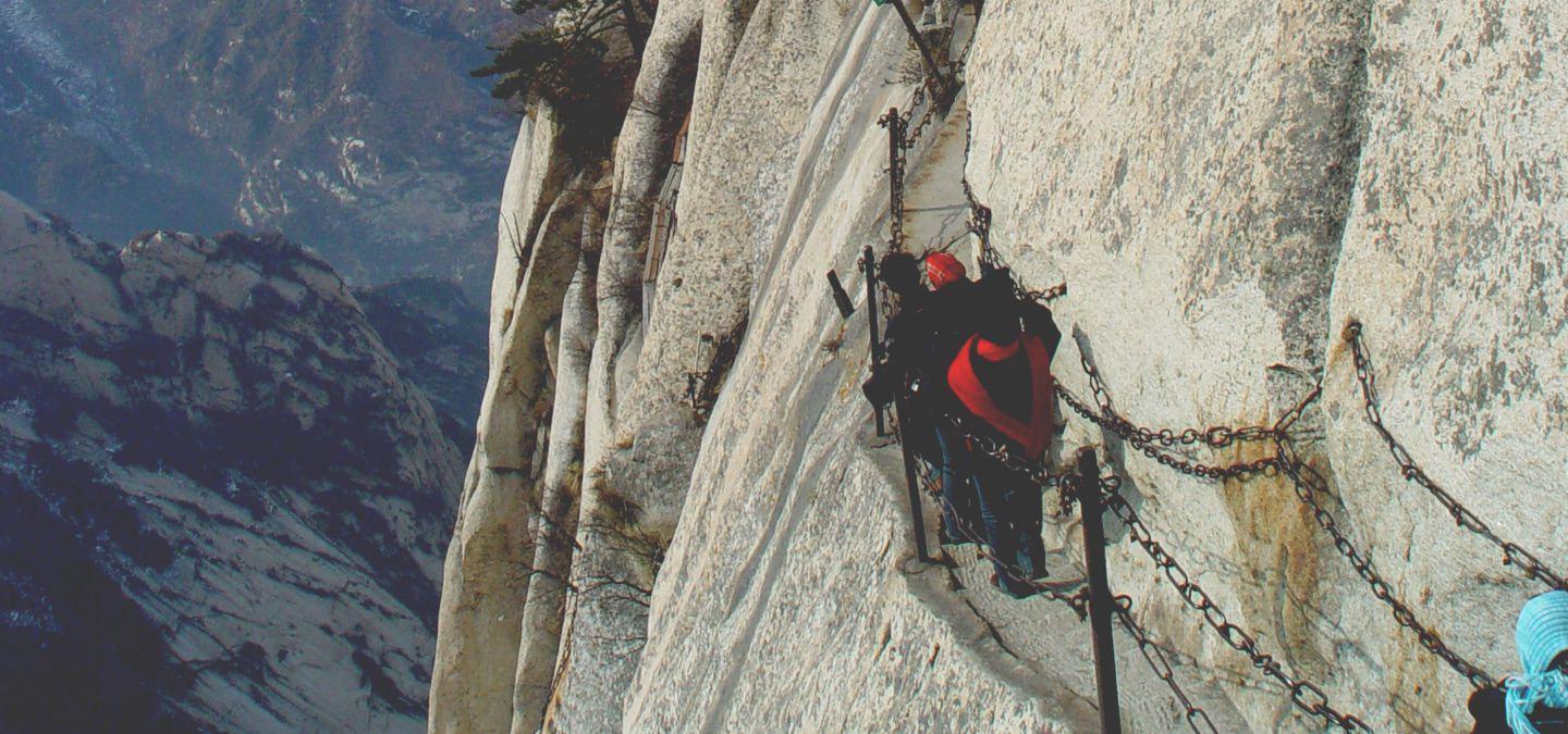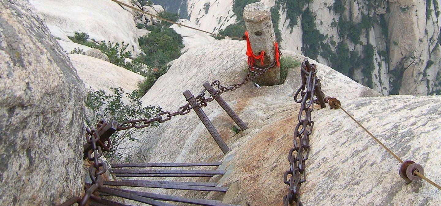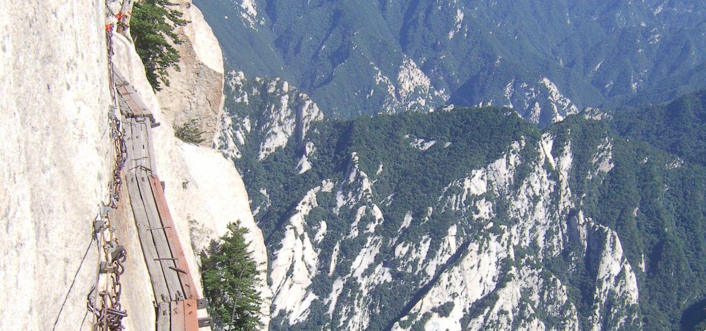 长空栈道位于华山南峰东侧山腰,是华山派第一代宗师元代高道贺志真为远离尘世静修成仙,在万仞绝壁上镶嵌石钉搭木椽而筑。栈道上下皆是悬崖绝壁,铁索横悬,由条石搭成尺许路面,下由石柱固定,游人至此,面壁贴腹,屏气挪步,被誉为“华山第一天险”。